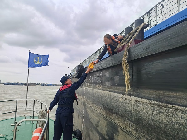 接报后,崇明海事局迅速响应,立即启动紧急救援预案,值班人员通过电话一方面详细询问船员症状、既往病史,并协助联系属地药店,提供联络方式供船员直接沟通。在药店的配合下,所需药品迅速确认并完成调配,为救援争取了宝贵的时间。另一方面立即指派南门海巡执法大队启动“海巡01080”轮全速驶向“鲁济宁**”轮锚泊水域。执法人员克服风大浪急的恶劣环境,与船方保持联系,了解病情发展和情绪安抚工作。经过近1小时“乘风破浪”,海巡艇顺利抵达“鲁济宁**”轮,执法人员将药品快速递至船员手中,同时告知若有需求及时联系。“太感谢了,你们真是解了燃眉之急。”船员拿到药品后连声道谢。